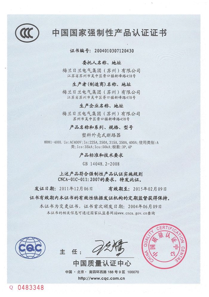MRM1-400L塑殼斷路器資質(zhì)證書(shū)
