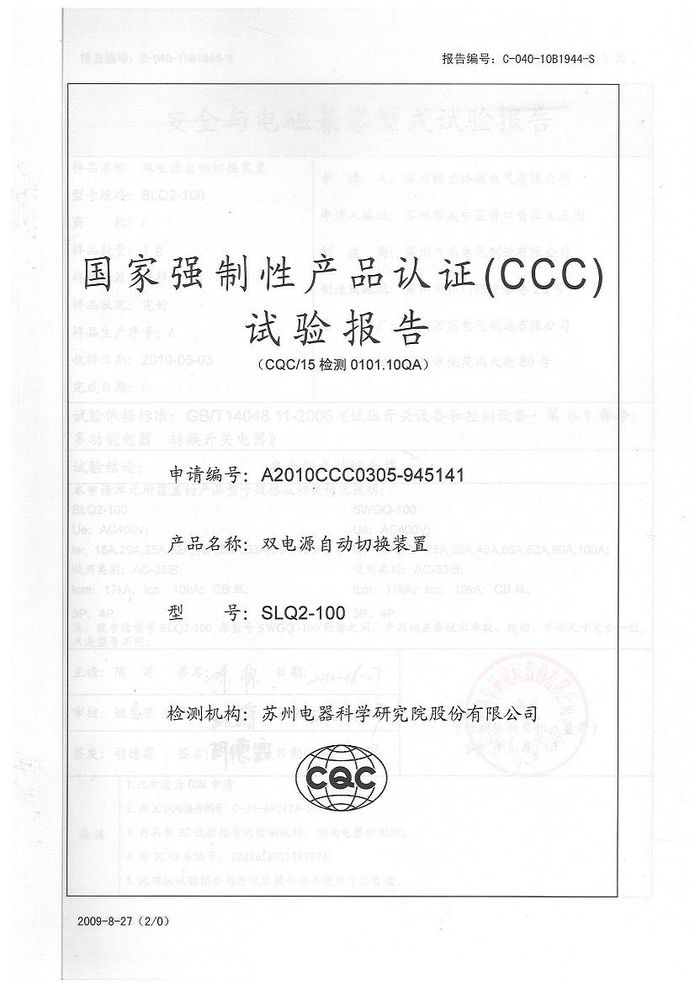 SLQ2-100雙電源資質(zhì)證書(shū)