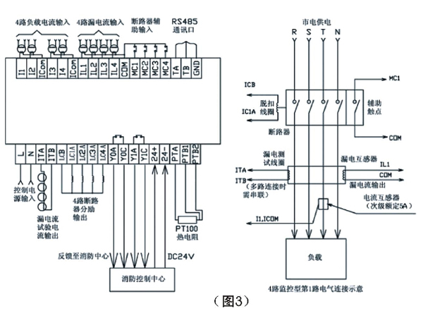 3、分體式剩余電流監(jiān)控探險(xiǎn)測器端子圖和外接線路圖