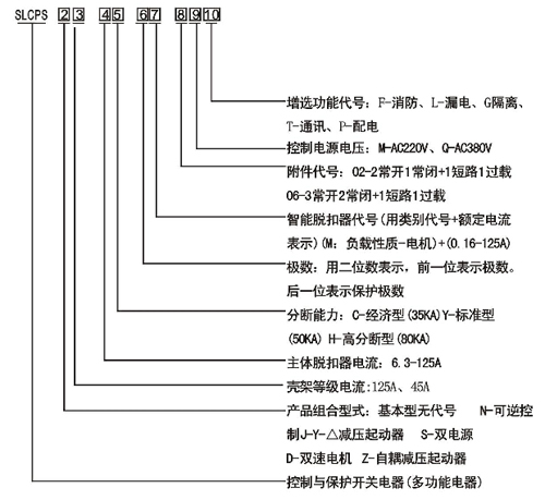 用戶在訂貨時(shí)應(yīng)寫明SLCPS控制與保護(hù)開關(guān)電器的產(chǎn)品型號、規(guī)格、短路脫扣器額定電流、智能控制器額定工作電流、負(fù)載性質(zhì)、線圈控制電壓、接線方式等內(nèi)容。